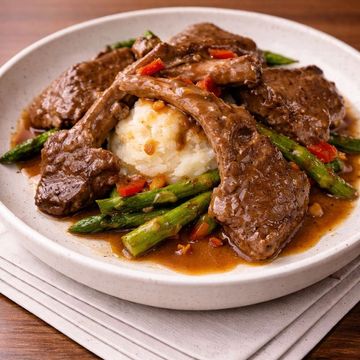 "Aussie Lamb Elegance—tender Australian Baby Lamb Chops grilled to perfection. Complemented by creamy mashed potatoes and crisp grilled asparagus, all beautifully unified by a rich red wine sauce."