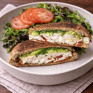 "Delight in our Balsamic Chicken and Avocado Sandwich, featuring tender chicken marinated in balsamic vinegar and paired with creamy avocado. Layered with sun-dried tomatoes and fresh baby arugula, then spread with aromatic basil pesto. All served on wholesome whole wheat bread for a satisfying fusion of flavors."