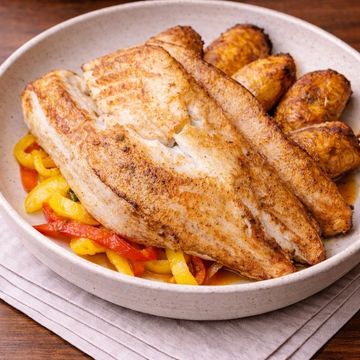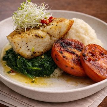 "Relish our Pan-Seared Branzino Fillet—delicately crisped and accompanied by a vibrant mango-citrus salad. Paired with sweet, baked plantains and finished with a zesty cilantro vinaigrette, it's a symphony of textures and tropical notes."
