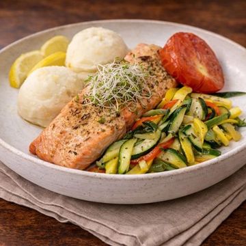 "Savor our Broiled Salmon Fillet—meticulously broiled for a flaky, melt-in-your-mouth experience. Accompanied by a colorful medley of crisp-tender vegetables, luscious roasted tomatoes, and our signature creamy mashed potatoes."