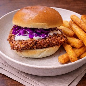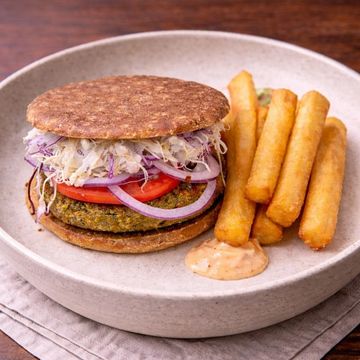 Embark on a culinary voyage with our White Fish Burger, featuring a succulent Grouper fish patty that's perfectly complemented by a medley of mixed vegetables. The burger is elevated by a dollop of zesty pesto mayonnaise and a layer of crisp arugula. Accompanied by our signature sweet potato thread fries and tangy onion pickles, this dish is a delightful fusion of flavors and textures. Choose your favorite style of fries to complete this seaside-inspired feast.