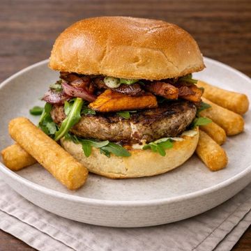 "Indulge your cravings with our mouthwatering selection of burgers, each one a masterpiece of flavor and juiciness. Crafted from the finest ingredients and cooked to perfection, our burgers are more than just a meal—they're an experience. Whether you're a fan of classic combinations or adventurous toppings, there's a burger here with your name on it."