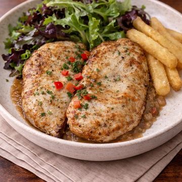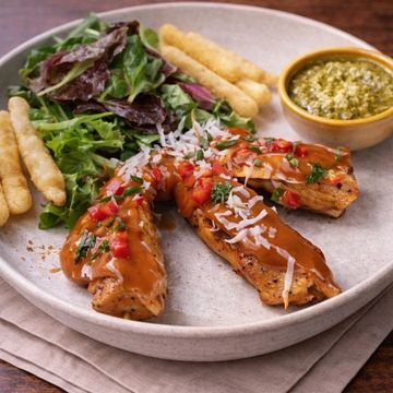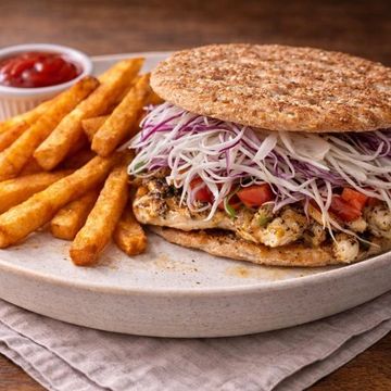 "Indulge in our Gourmet Chimi Burger Chicken, featuring tender grilled chicken breast elevated by our homemade Chimi sauce. Topped with a crisp medley of fresh cabbage, onions, and tomatoes, all nestled between slices of flat whole wheat bread. It's a gourmet twist that redefines the chicken burger experience."