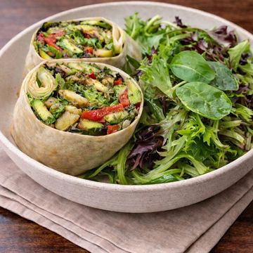 "Savor the richness of our Grilled Vegetables and Avocado Wrap, featuring a medley of grilled zucchini, red pepper, and onions. Enhanced with a savory eggplant spread and accented by sun-dried tomatoes and mixed greens. Topped with creamy avocado and wrapped in a soft tortilla, it's a plant-based feast that's a symphony of flavors and textures."