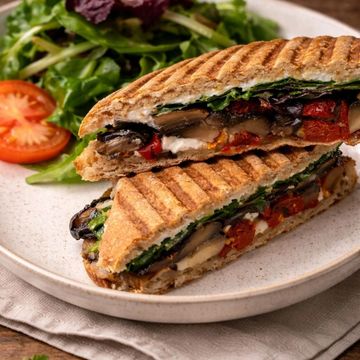 "Savor our Grilled Portobello and Goat Cheese Sandwich, featuring tender Portobello mushrooms and creamy goat cheese layered with sun-dried tomatoes and fresh baby greens. All lovingly sandwiched between slices of focaccia-style whole wheat bread. It's a medley of earthy flavors and satisfying textures."