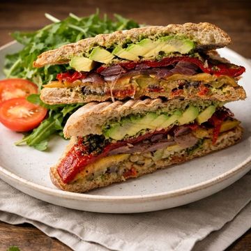 "Savor our Grilled Vegetables and Avocado Sandwich, featuring a medley of grilled red pepper, zucchini, eggplant, and onions. Complemented by sun-dried tomatoes and enhanced with a spread of aromatic basil pesto. Topped with creamy avocado and served on hearty whole-wheat bread, it's a plant-based feast that's a symphony of grilled flavors and textures."