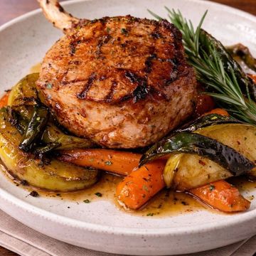 "Grilled Center Cut Pork Chops – A masterpiece of succulence, served with caramelized carrots, chive mashed potatoes, and apple poblano chutney. A symphony of flavors that defines Dominican fusion cuisine."