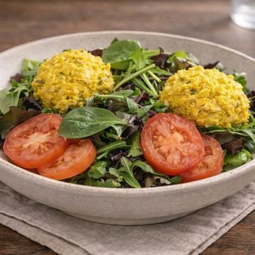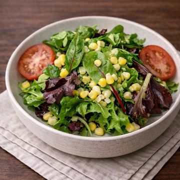 Fresh mixed greens with ripe tomatoes and crisp corn, lightly tossed for a clean, refreshing bite.