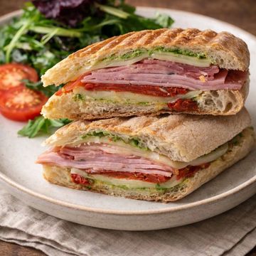 "Embark on a flavorful journey through Italy with our signature Italian Panini. Slathered with aromatic basil pesto, this sandwich boasts the rich and savory notes of black forest ham, soppressata, and peperoni. The boldness of these meats is beautifully balanced by the smooth melt of provolone cheese. All these wonders are pressed between the golden crusts of a ciabatta bread, toasted to perfection. It's an Italian symphony in every bite, promising a moment of pure culinary bliss."