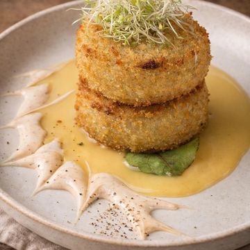 "Each piece delicately coated in a tropical coconut crust and fried to a golden, crispy perfection. Paired with a tangy Tamarind Sauce that adds a burst of exotic flavor, and served on a bed of peppery arugula and tender alfalfa sprouts for a refreshing contrast. It's a culinary escape to the tropics in every bite."