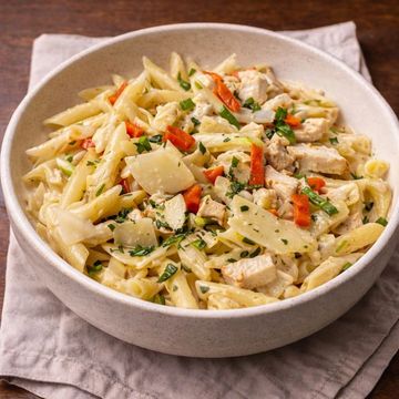 Enjoy a medley of garden-fresh vegetables and penne pasta, luxuriously coated in a white wine basil cream sauce. Customize your feast with your choice of succulent chicken or tender shrimp. A vibrant, creamy dish tailored to your taste.
