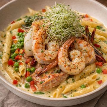 Dive into the rich flavors of our Pesto White Beans and Shrimps pasta. Al dente penne is paired with hearty white beans and succulent shrimp, all enveloped in a creamy, homemade pesto sauce. A harmonious blend of textures and flavors that offers a unique twist on a classic Italian dish.