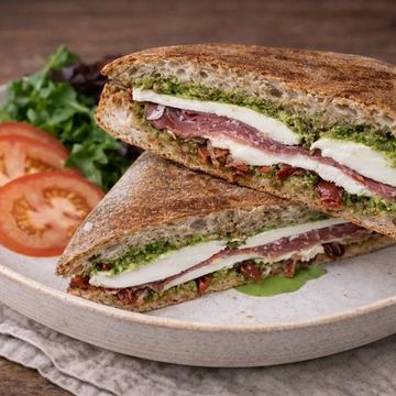 "Indulge in our Prosciutto and Fresh Mozzarella Sandwich, featuring thinly-sliced, savory prosciutto and creamy mozzarella. Accented with sun-dried tomatoes and a spread of aromatic basil pesto, then finished with a drizzle of balsamic vinegar. Served on wholesome whole wheat bread, it's a classic Italian experience reimagined."