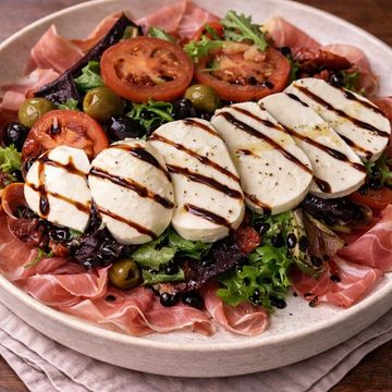 "Savor the harmony of Prosciutto Di Parma and creamy fresh mozzarella, accompanied by sun-kissed tomatoes and rich sundried counterparts. This symphony of flavors rests atop a fresh bed of tender baby greens, punctuated by an assortment of marinated olives. A perfect meld of Italian tradition and refreshing greens."