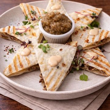 "A crispy tortilla filled with succulent, herb-infused duck and melted cheese. Served with a side of our smoky Roasted Eggplant Tapenade for an unforgettable flavor fusion."