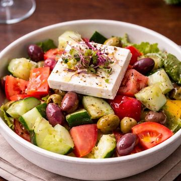 "Savor our Traditional Greek Salad, a vibrant blend of crumbled Feta Cheese, mixed olives, and garden-fresh vegetables including plum tomatoes, cucumber, and bell peppers. Accented with red onion and finished with a generous drizzle of extra virgin olive oil, this salad captures the essence of the Mediterranean."