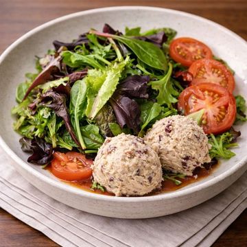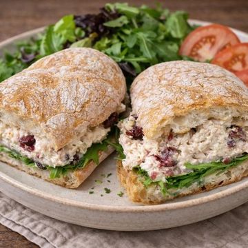 "Delight in our unique Tuna, Cranberry, and Fuji Apple Salad, featuring tender tuna mingled with tart cranberries and diced Fuji apples. Served on a bed of fresh baby greens, accented with sliced tomatoes, and dressed with our signature house vinaigrette. A harmonious blend of flavors that's both refreshing and satisfying."