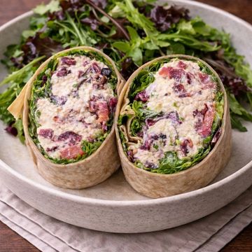 "Discover our Tuna Cranberry and Fuji Apple Salad Wrap, a unique blend of tender tuna, tart cranberries, and diced Fuji apples. Paired with mixed greens, fresh tomatoes, and delicate alfalfa sprouts, all brought together by our signature house dressing. Wrapped in a soft tortilla, it's a refreshing medley of flavors in every bite."