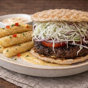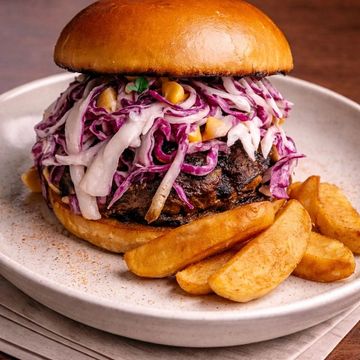 "Embark on a culinary journey with our Turkish Style Grilled Lamb Burger. Succulent grilled lamb, spiced to perfection, is complemented by our homemade mixed cabbage coleslaw, featuring corn, onions, and crumbled feta cheese. A drizzle of light mustard adds a tangy kick, all enveloped in a buttery brioche bun. It's a world of flavors, united in one extraordinary burger."