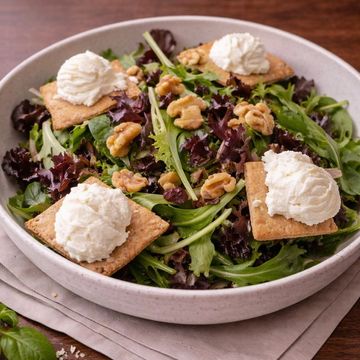 "Relish our Organic Baby Greens and Warm Goat Cheese Salad, featuring creamy, warm goat cheese paired with garlic croutons, sweet dried cranberries and crunchy walnuts for that extra crunch, it's a symphony of textures and flavors in every forkful."