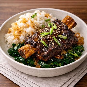 "Dijon-Crowned Braised Short Ribs—tender beef ribs elevated by a luxurious Dijon mustard sauce. Paired with tangy Southern-Style coleslaw, crisp asparagus, and golden yucca fries, this dish offers a feast for the senses."