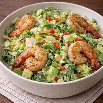 "Experience our Grilled Shrimp Caesar Salad, featuring tender shrimp grilled to smoky perfection, complemented by fresh corn and shaved Parmesan. Nestled on a bed of crisp romaine hearts and finished with our creamy Caesar dressing, it's a contemporary take on a timeless favorite."