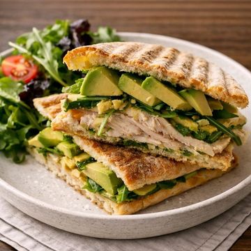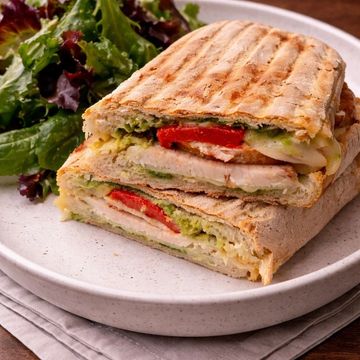 "Dive into layers of succulence with our Baked Chicken & Avocado Panini. Every bite is a harmonious blend of perfectly baked chicken and creamy avocado slices. The peppery hint of fresh arugula is beautifully complemented by the aromatic embrace of basil pesto, all nestled between the rustic charm of toasted ciabatta bread. A true gourmet delight that promises a symphony of flavors with every crunch."