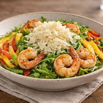"Discover our Grilled Shrimp Arugula Salad, featuring tender grilled shrimp atop a bed of peppery arugula, complemented by a spicy mango and pineapple salad. Finished with shaved Parmesan and a drizzle of homemade balsamic vinaigrette, it's a tropical twist on a classic favorite."