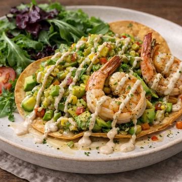 "Discover the flavors of our Grilled Shrimp Tostada, where succulent shrimp meet a smoky Chipotle sauce for a kick of spice. Paired with a refreshing Avocado Corn Salad and served on a crispy corn tortilla, all resting on a bed of fresh baby greens. It's a symphony of taste and texture in every bite."