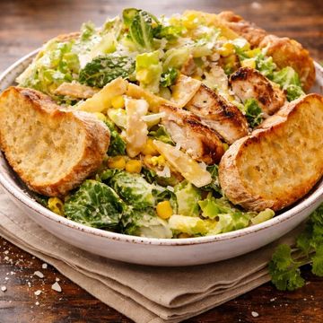 "Experience our Grilled Chicken Caesar Salad, featuring tender grilled chicken breast and fresh corn, all atop crisp romaine hearts. Finished with shaved Parmesan and a creamy Caesar dressing for a classic dish with a modern twist."